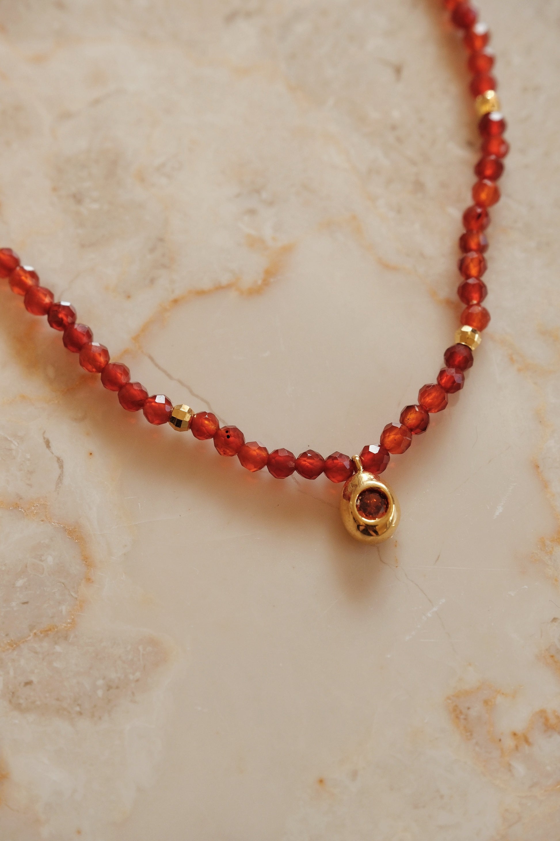Each faceted red agate bead carries a quiet vitality — a reminder to embrace strength and passion in every moment. The petite teardrop pendant, framed in 18K gold vermeil, adds a touch of radiance that feels both elegant and grounding.