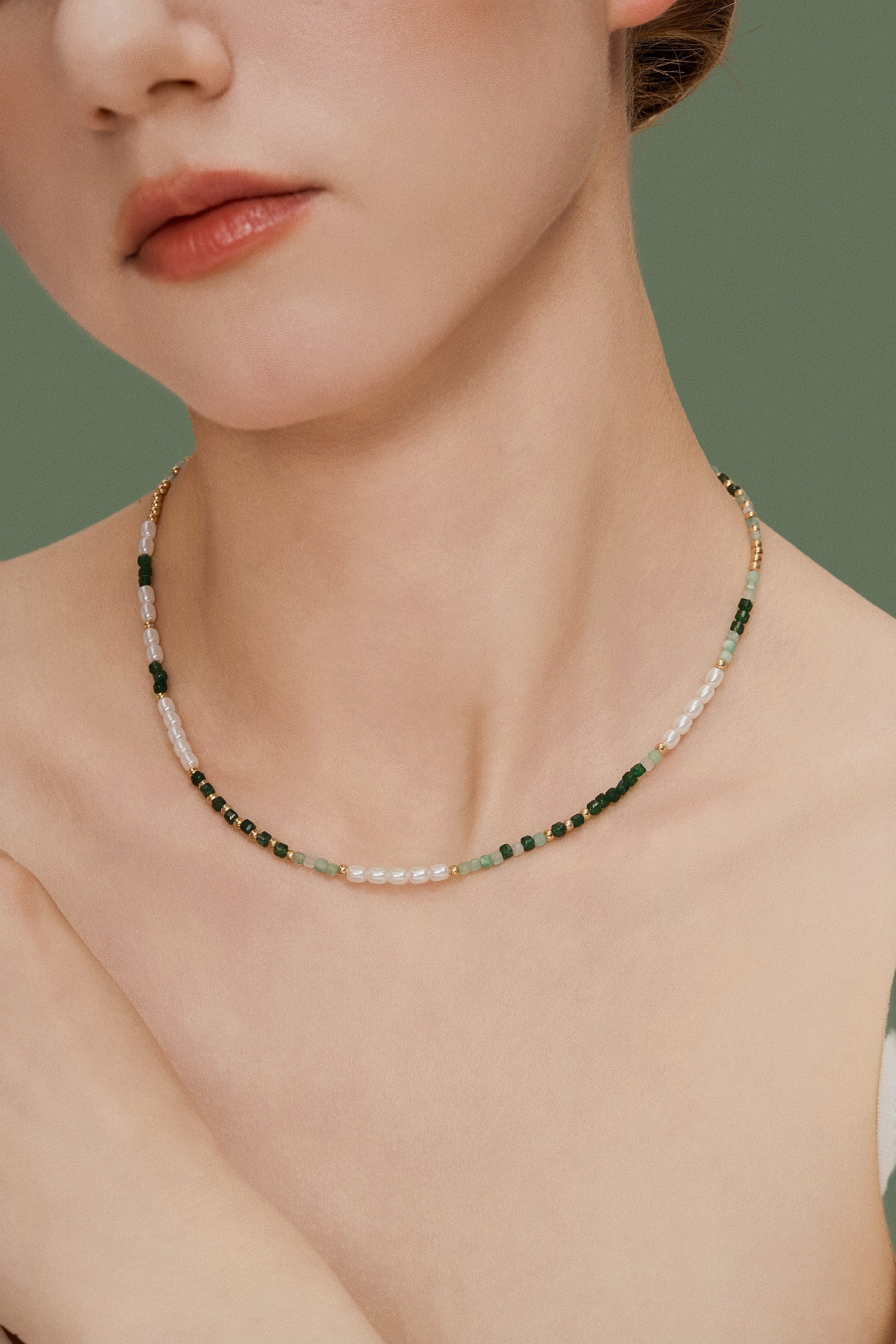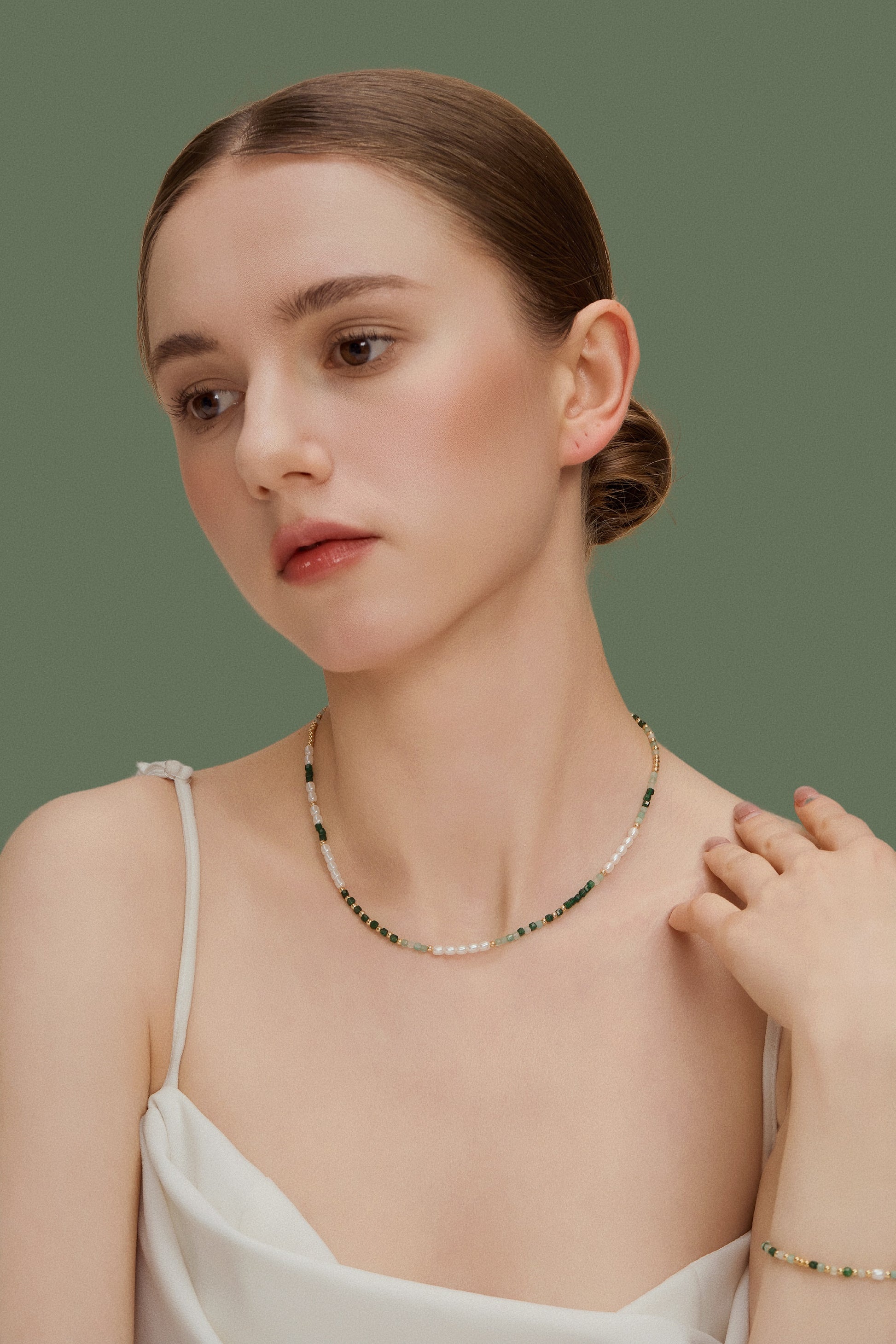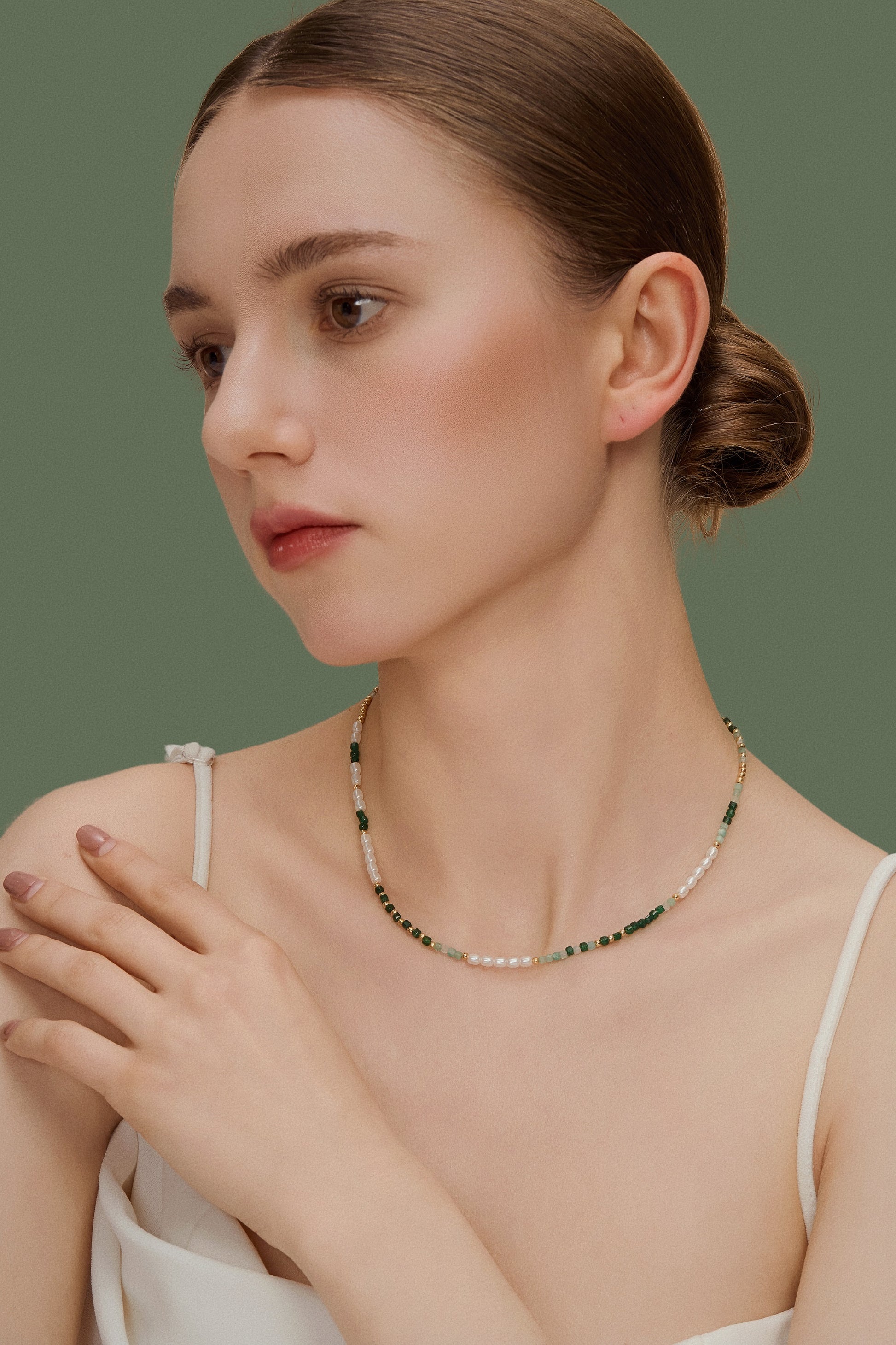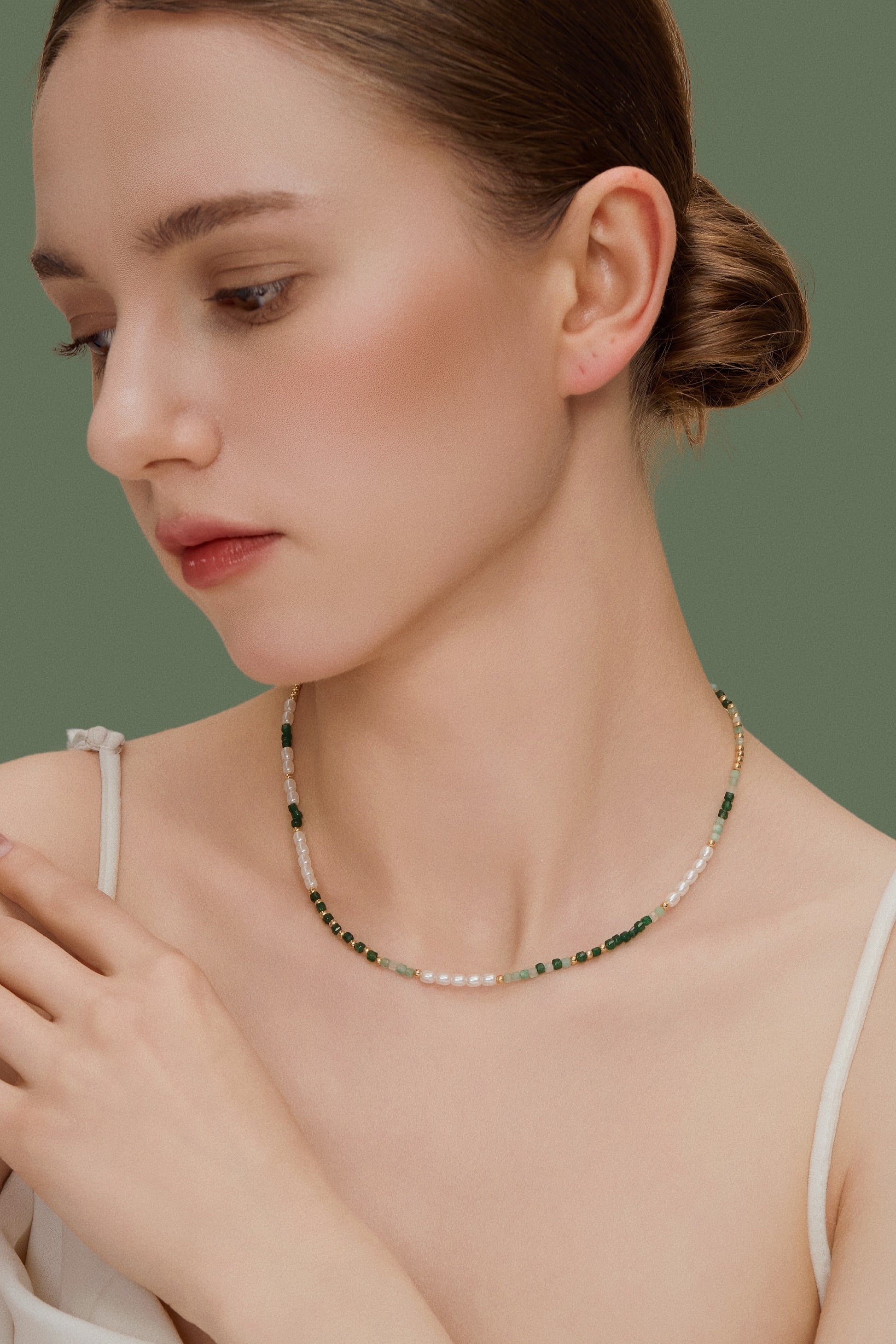 Graceful as a breeze drifting through wild meadows, the Meadow Breeze Necklace blends natural elegance with tranquil charm. Featuring a harmonious composition of green onyx, soft chrysoprase, and luminous freshwater pearls, each bead is meticulously hand-strung to evoke a sense of calm, clarity, and quiet strength.