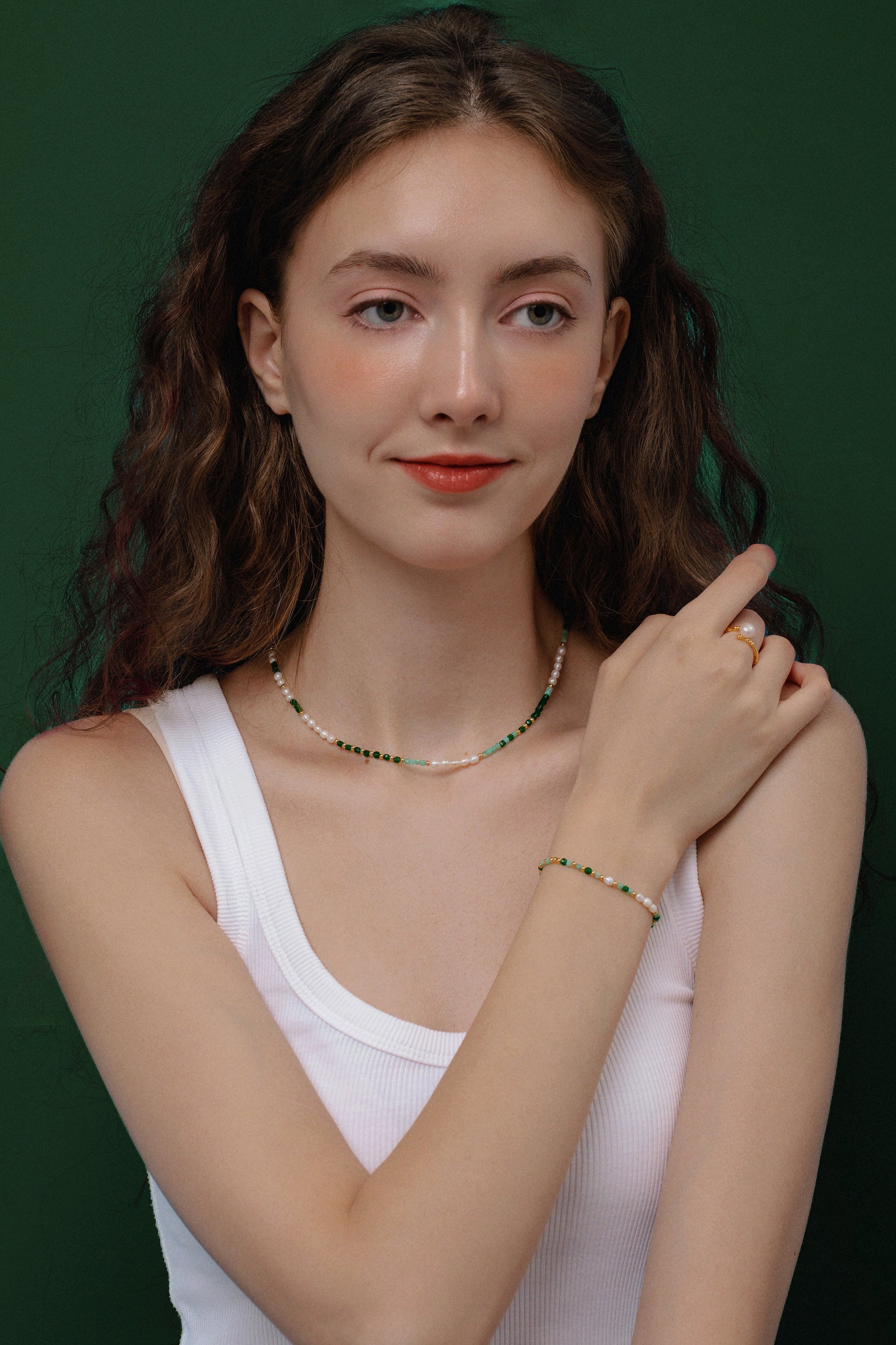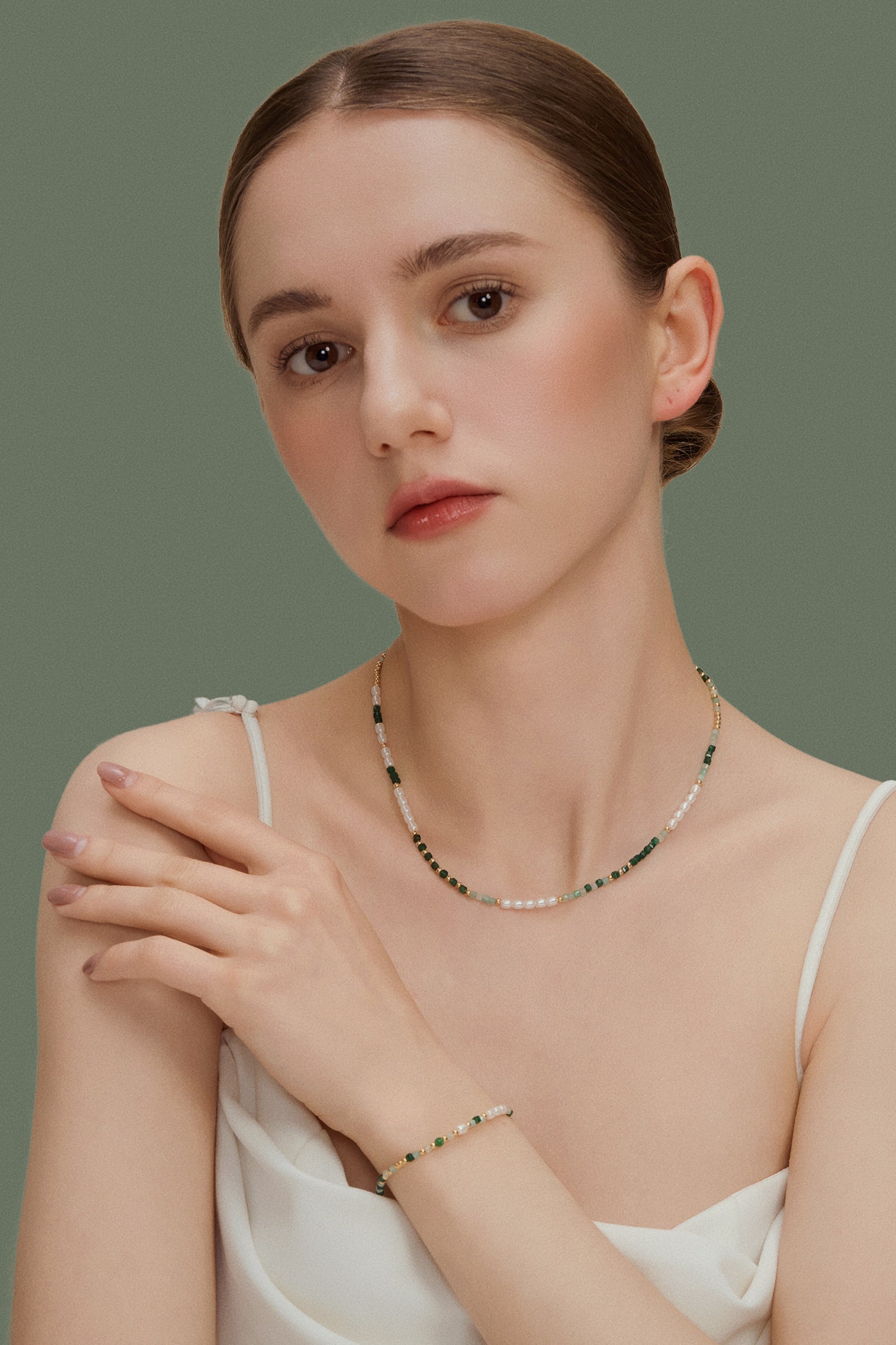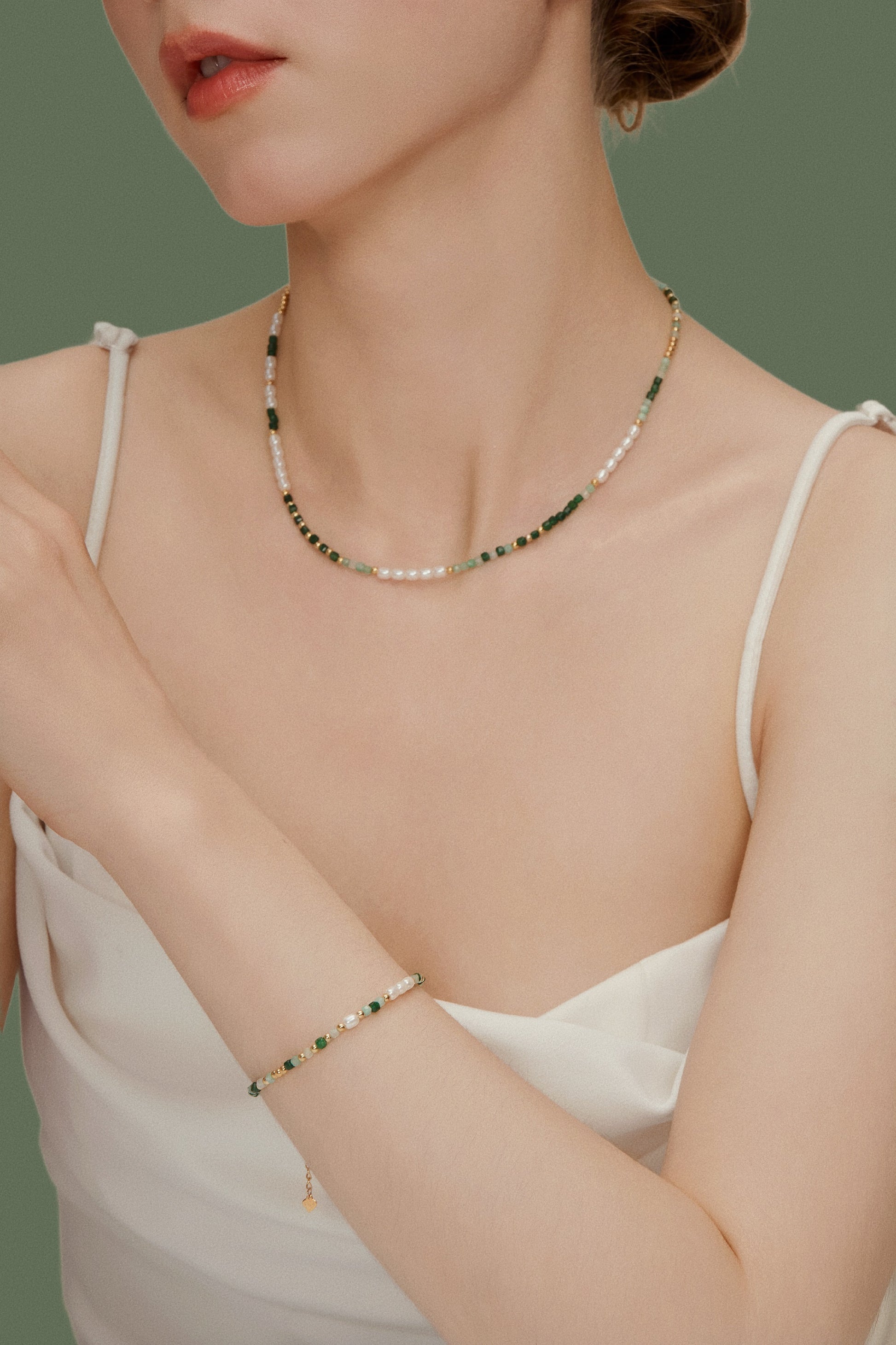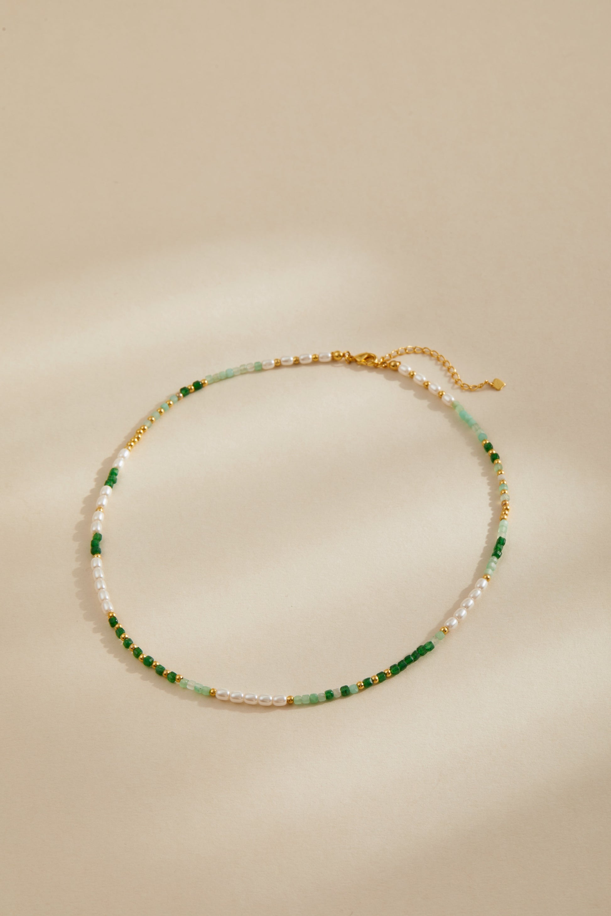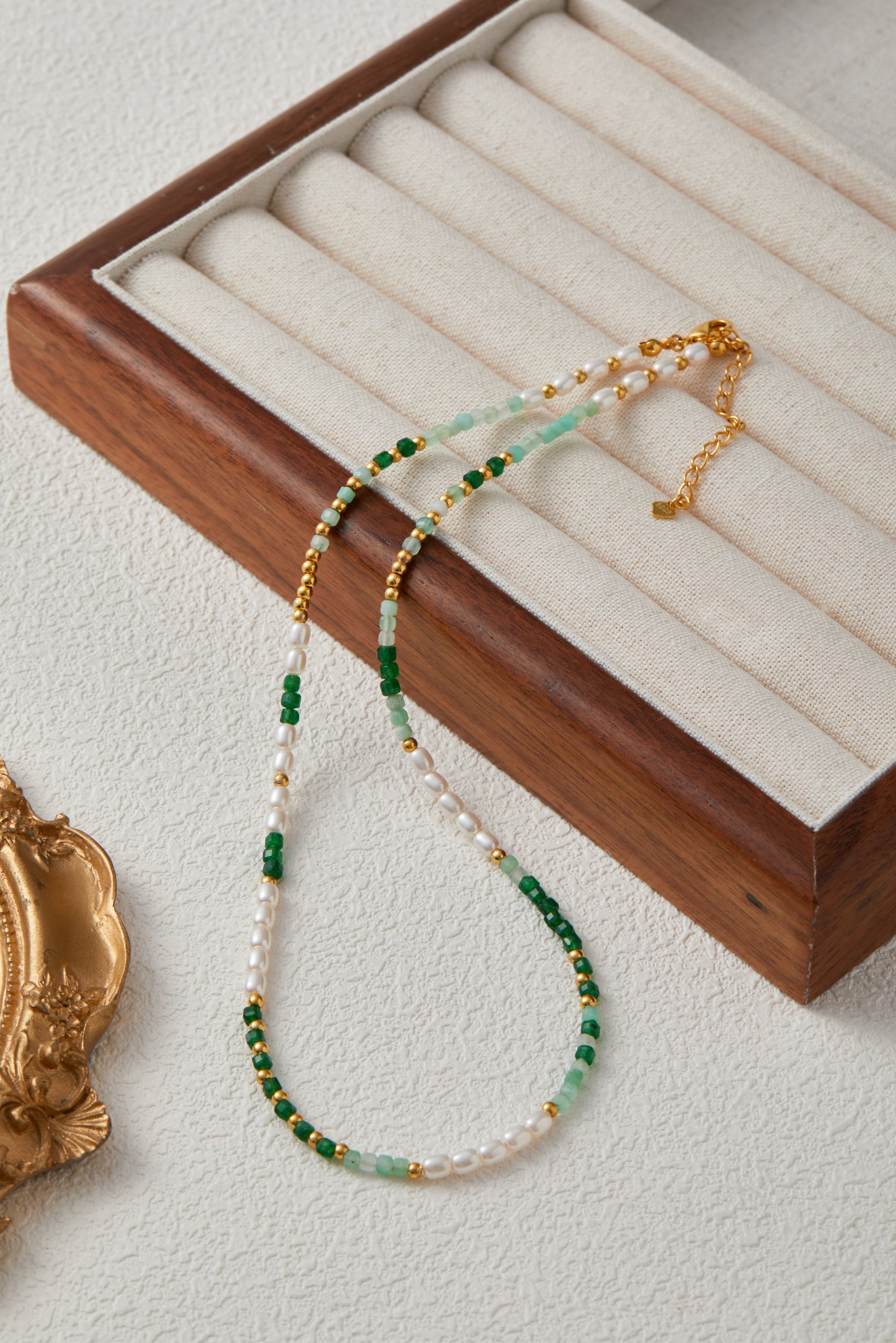 Graceful as a breeze drifting through wild meadows, the Meadow Breeze Necklace blends natural elegance with tranquil charm. Featuring a harmonious composition of green onyx, soft chrysoprase, and luminous freshwater pearls, each bead is meticulously hand-strung to evoke a sense of calm, clarity, and quiet strength.