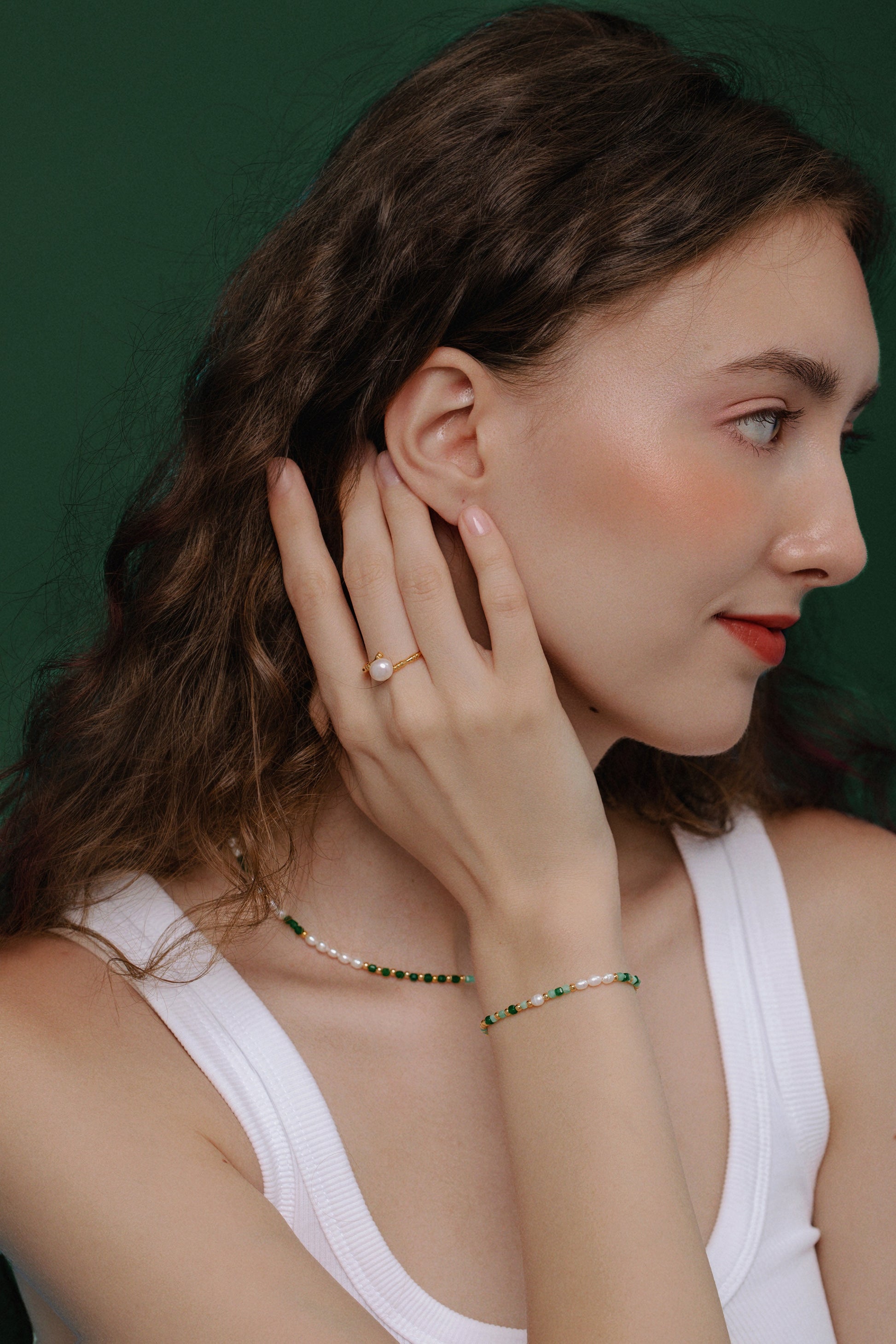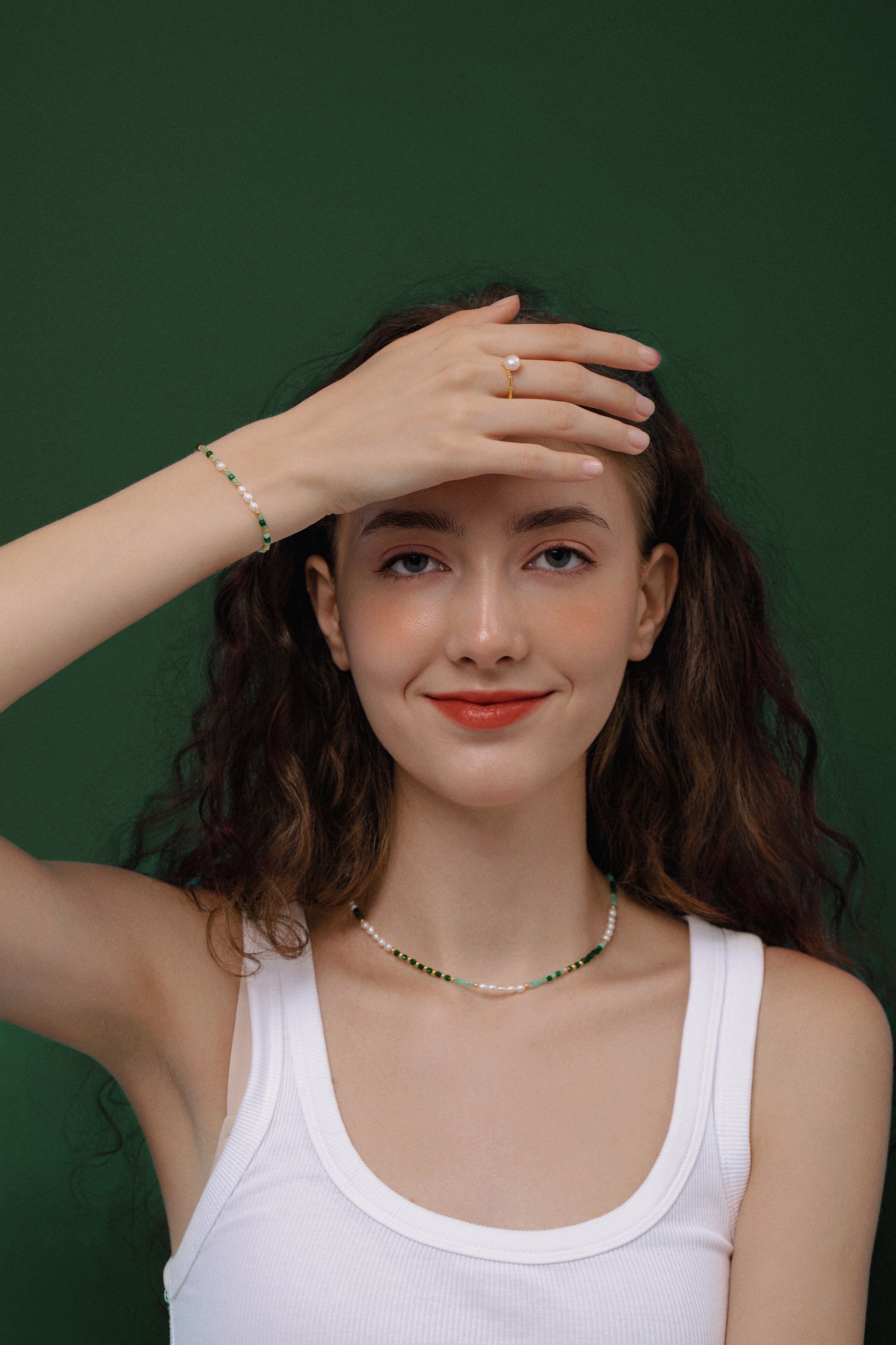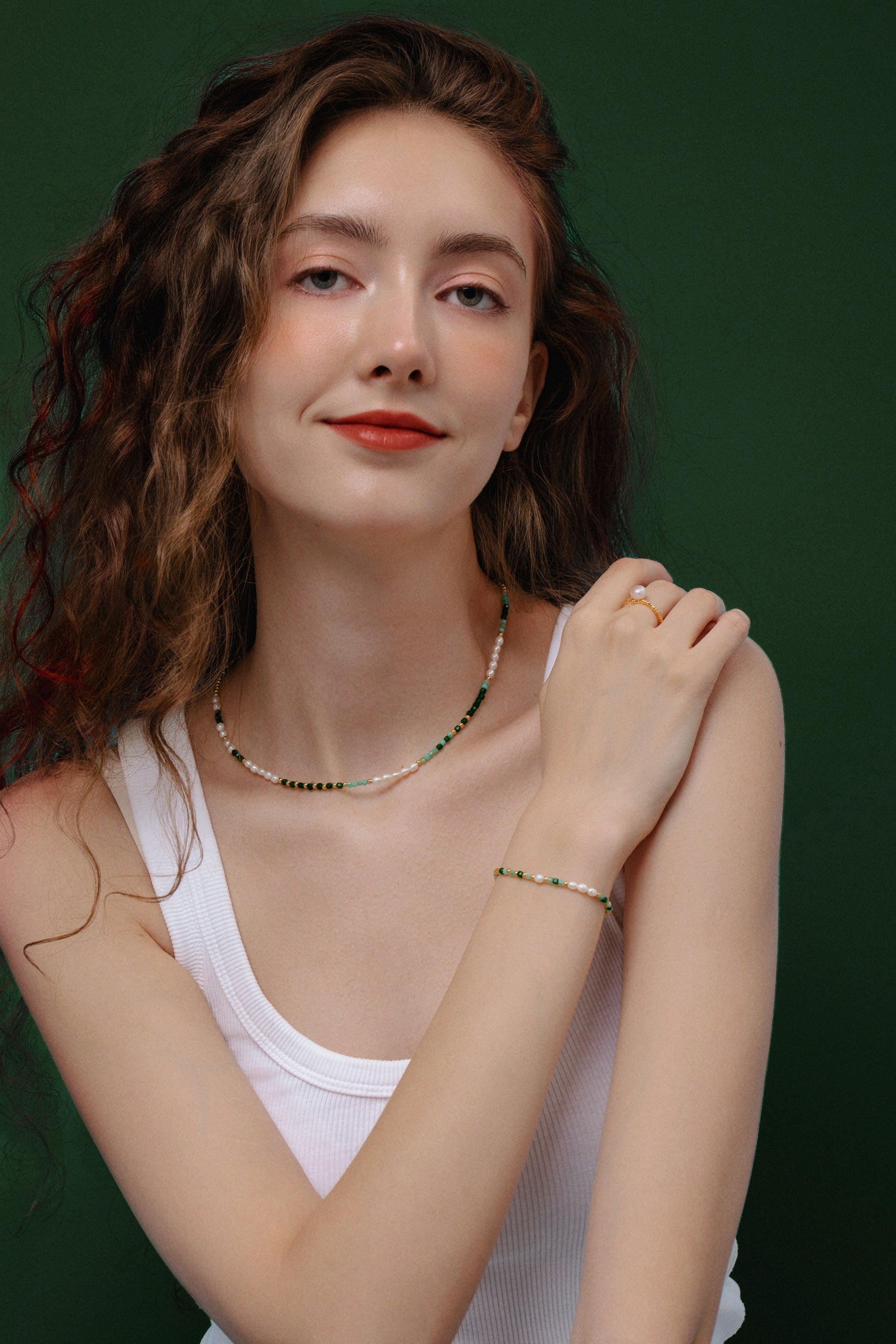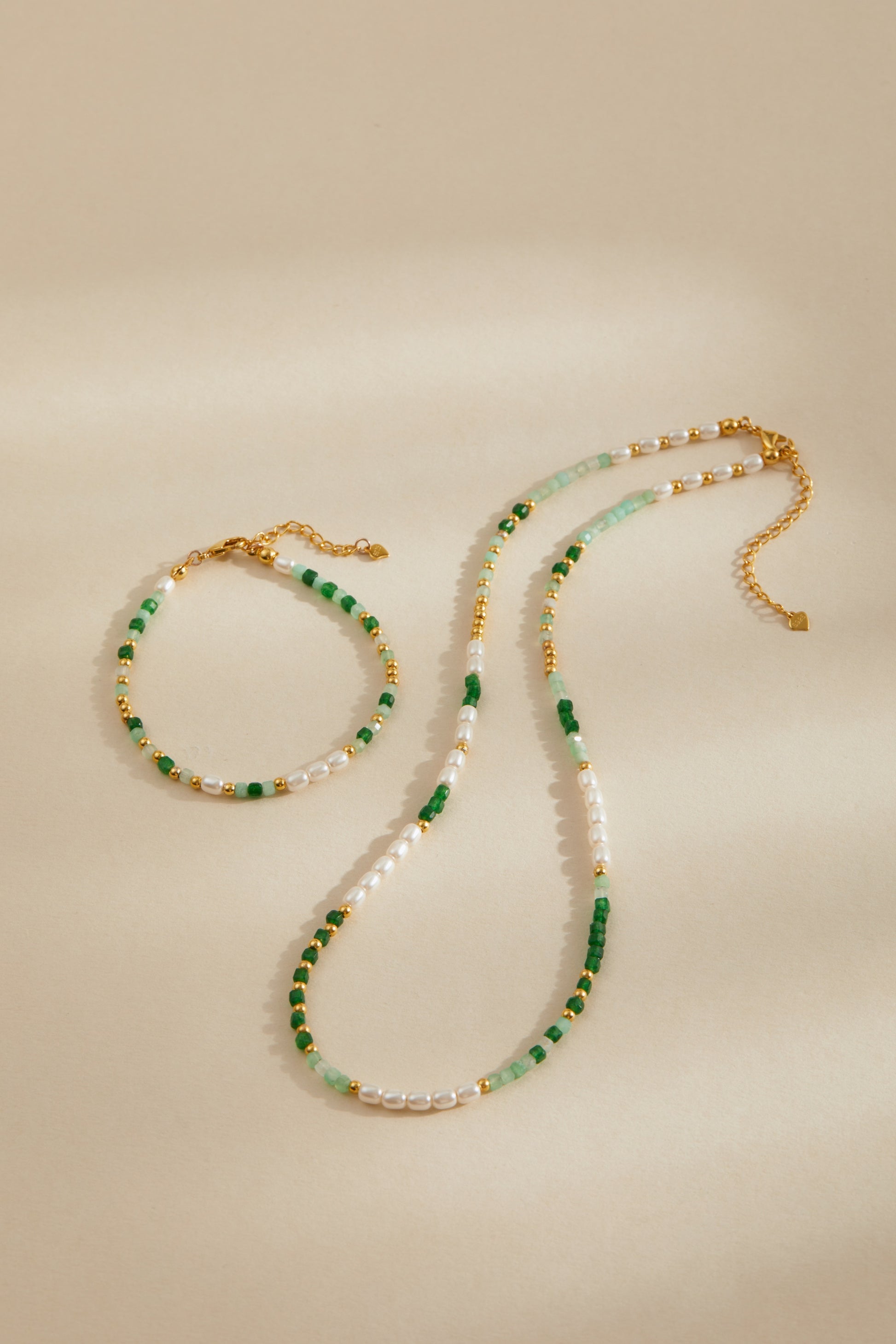 Graceful as a breeze drifting through wild meadows, the Meadow Breeze Necklace blends natural elegance with tranquil charm. Featuring a harmonious composition of green onyx, soft chrysoprase, and luminous freshwater pearls, each bead is meticulously hand-strung to evoke a sense of calm, clarity, and quiet strength.