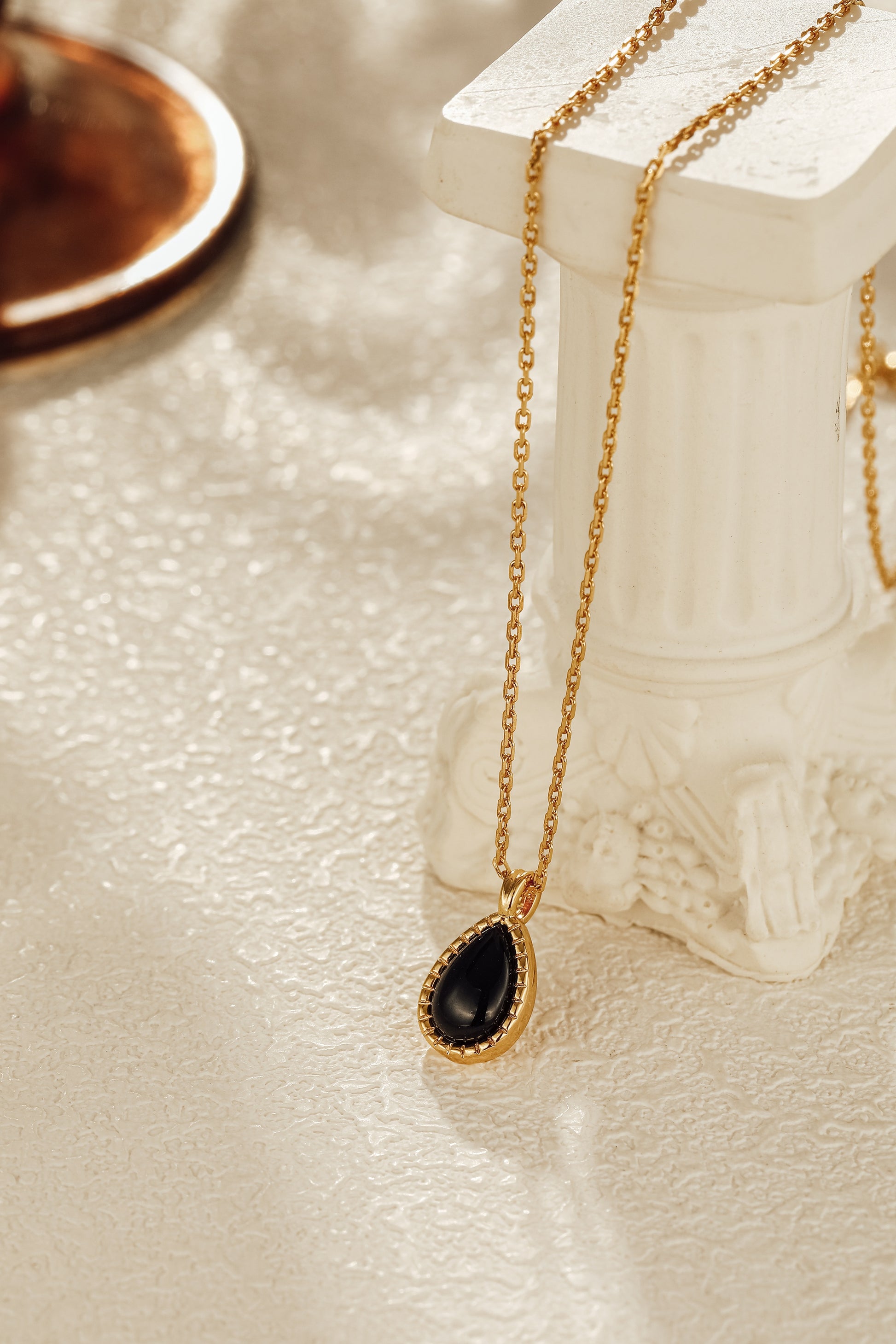The Nocturne Pear Shape Pendant Necklace captures the beauty of contrast — the deep stillness of night balanced by the warm glow of gold.