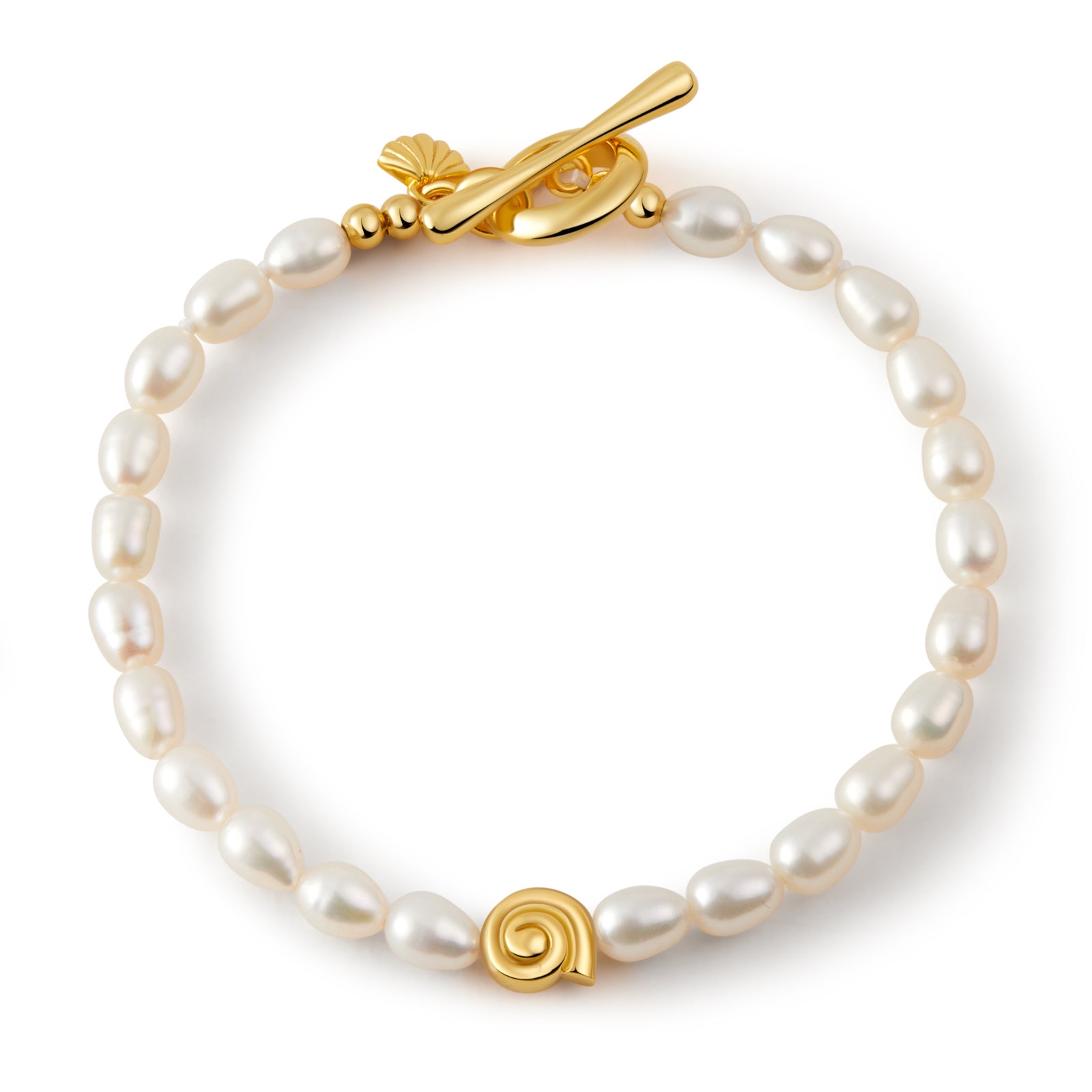 Inspired by the quiet poetry of the sea, the Ocean Waltz bracelet is a delicate dance of light and movement. Strung with luminous baroque freshwater pearls (approx. 4.5–5mm), each bead tells a story shaped by water and time. A sculpted golden shell and spiral charm add a whisper of ocean magic, while the toggle clasp is adorned with a petite shell — like a secret keepsake from a sunlit shore.