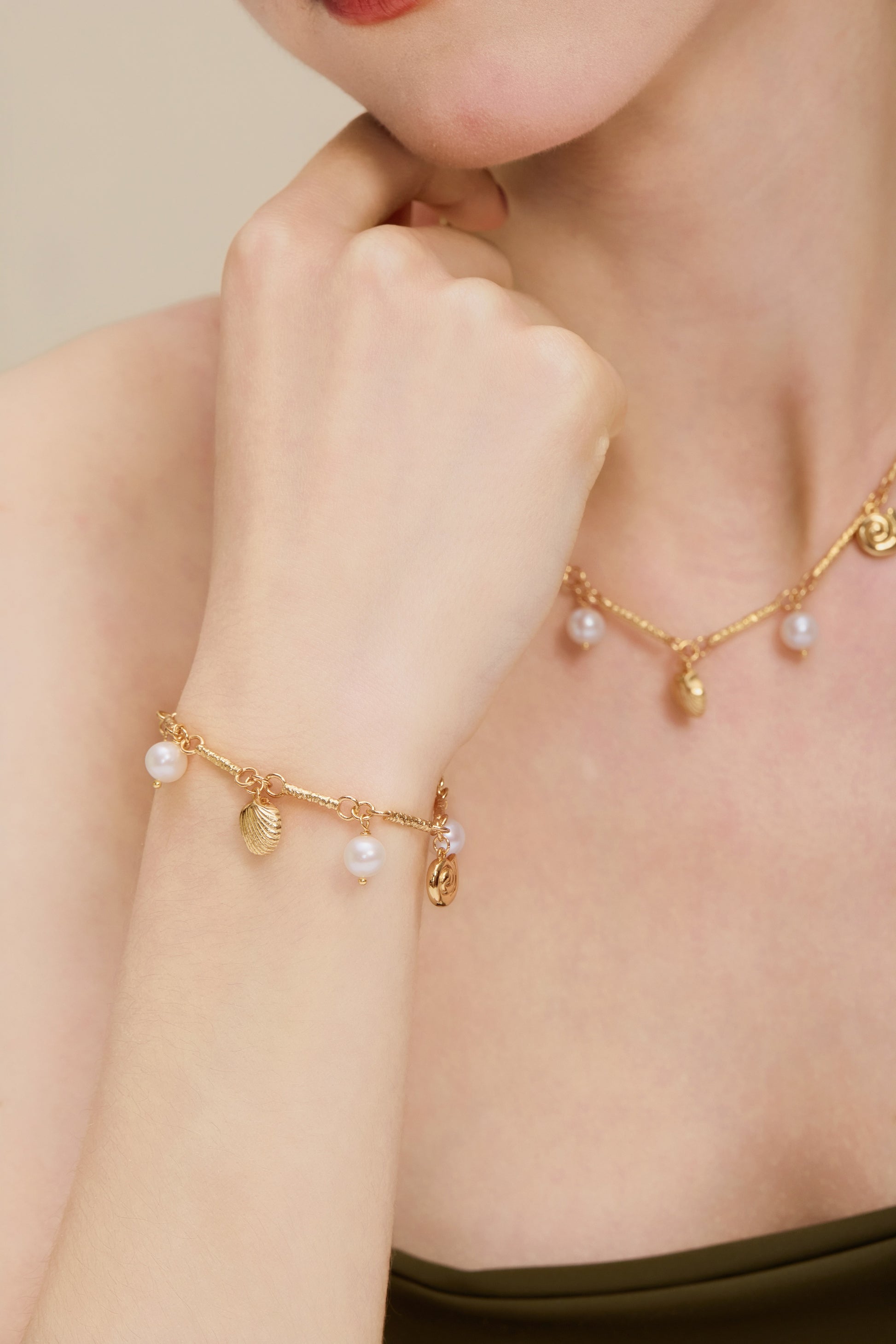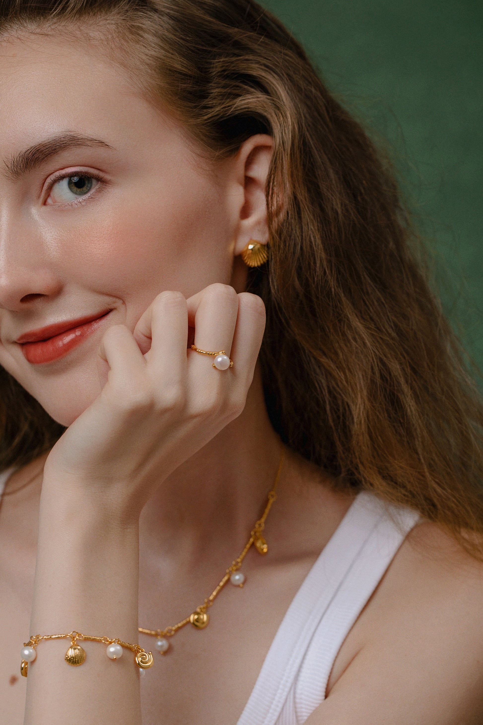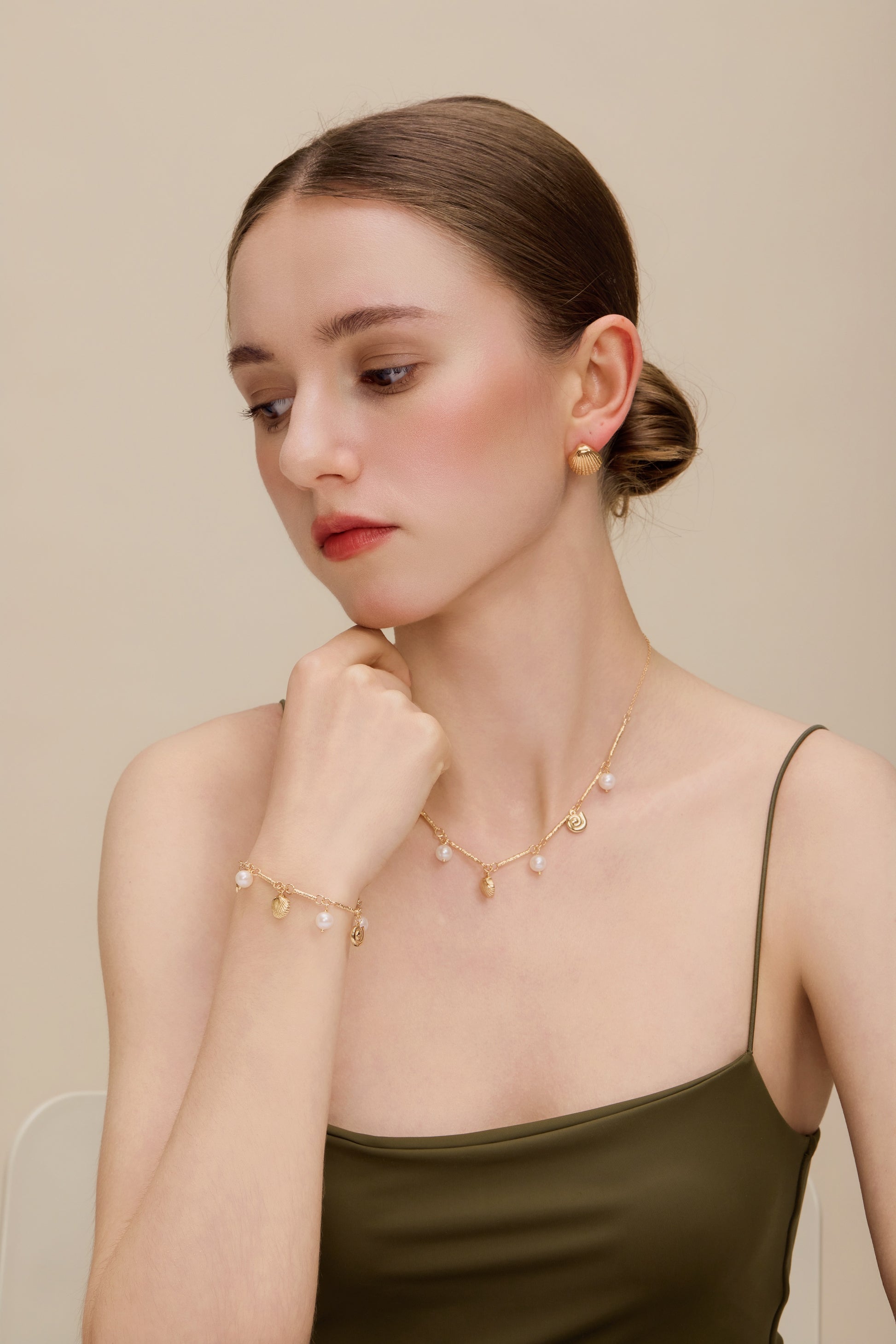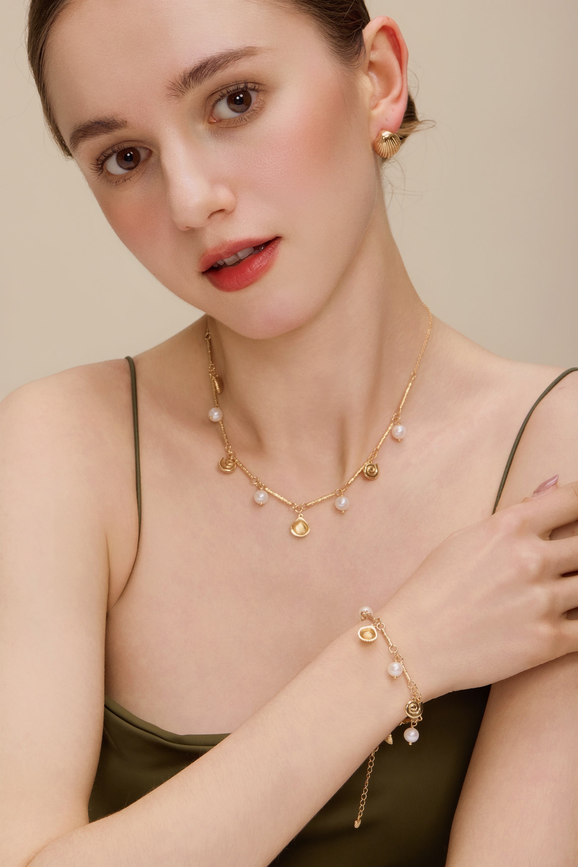 A dance of shells and pearls around your wrist — the Ocean Waltz Bracelet is an ode to seaside memories. With delicate freshwater pearls and whimsical charms shaped like golden conchs and scallop shells, this bracelet sways with every movement like waves meeting the shore.