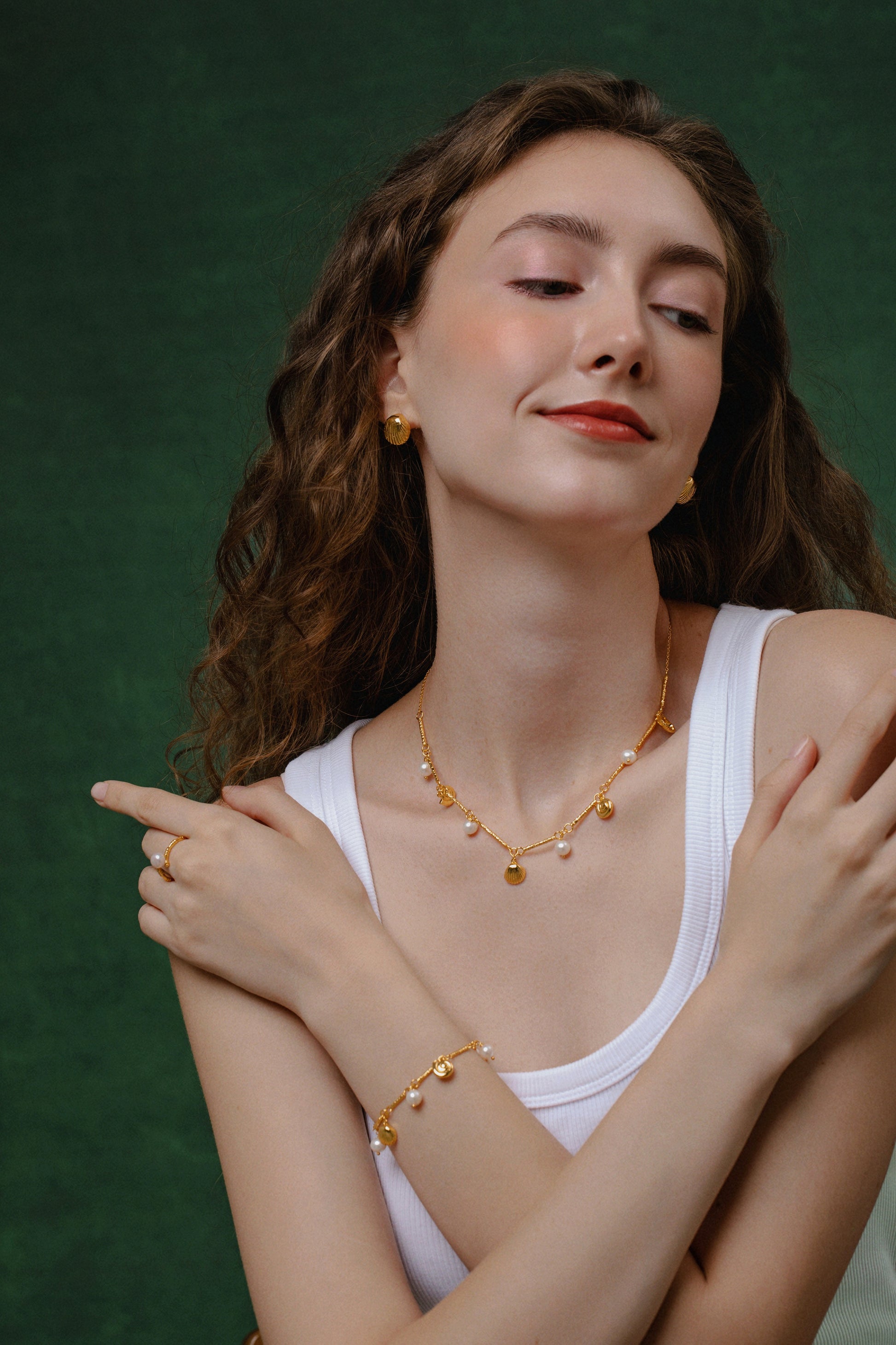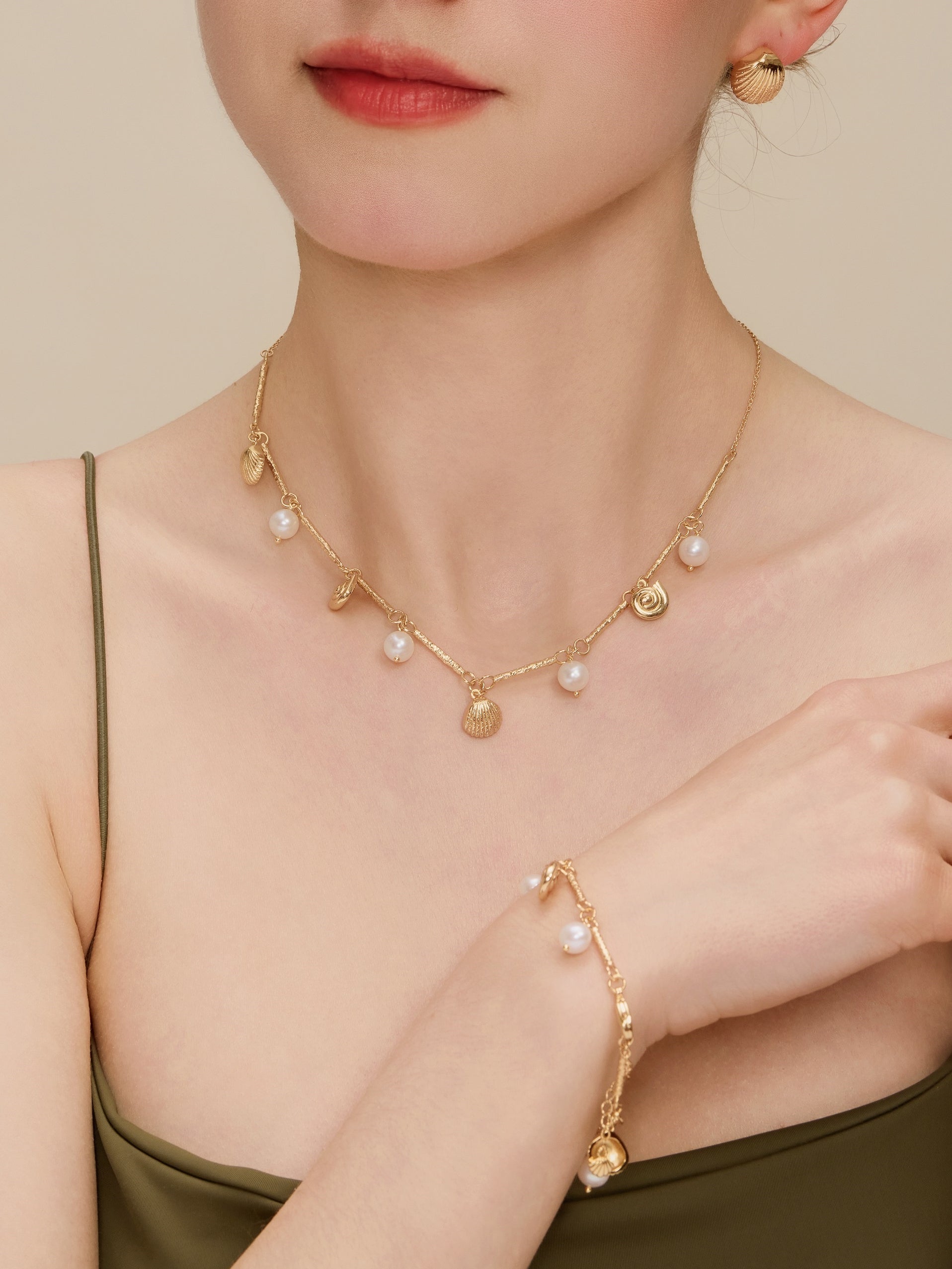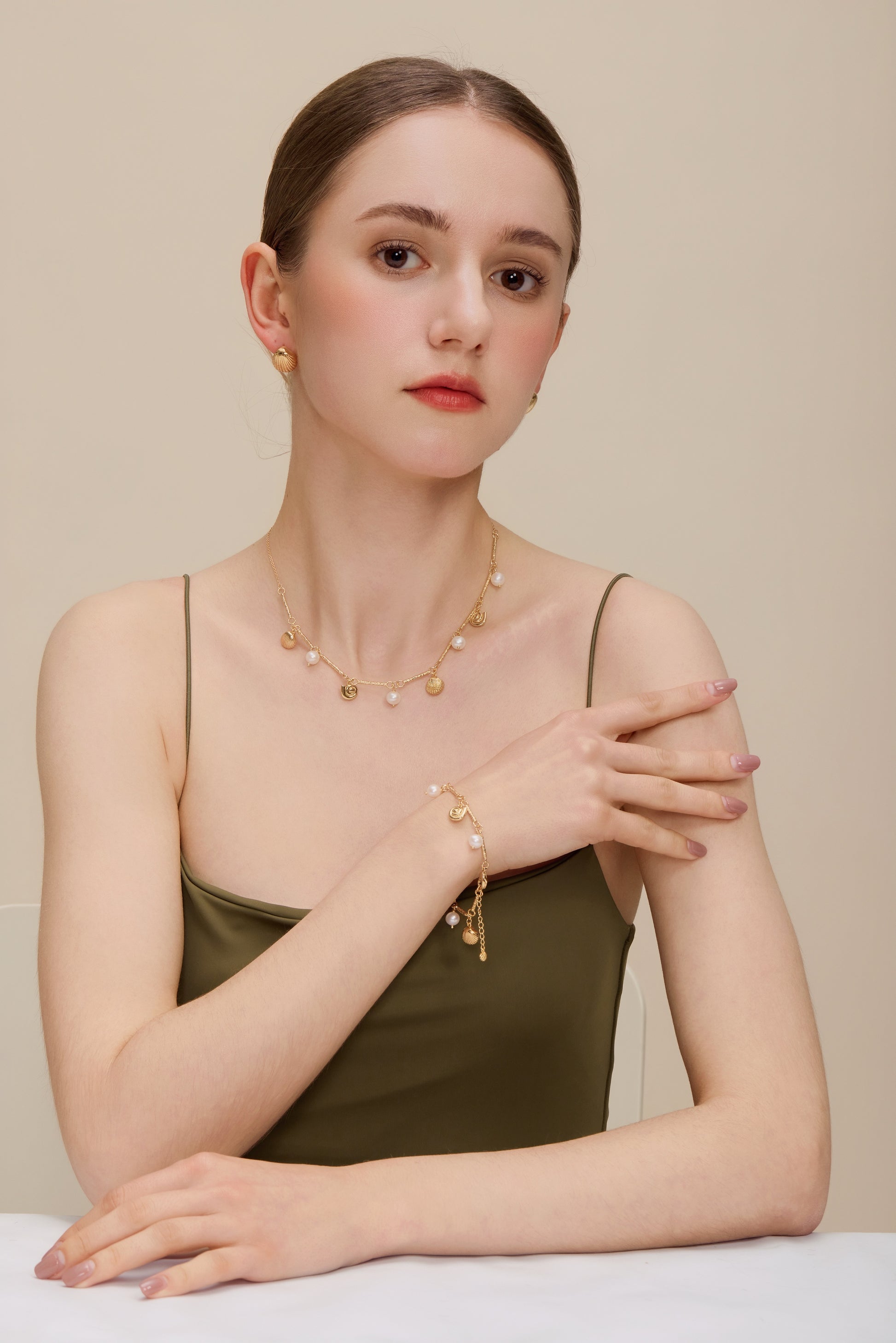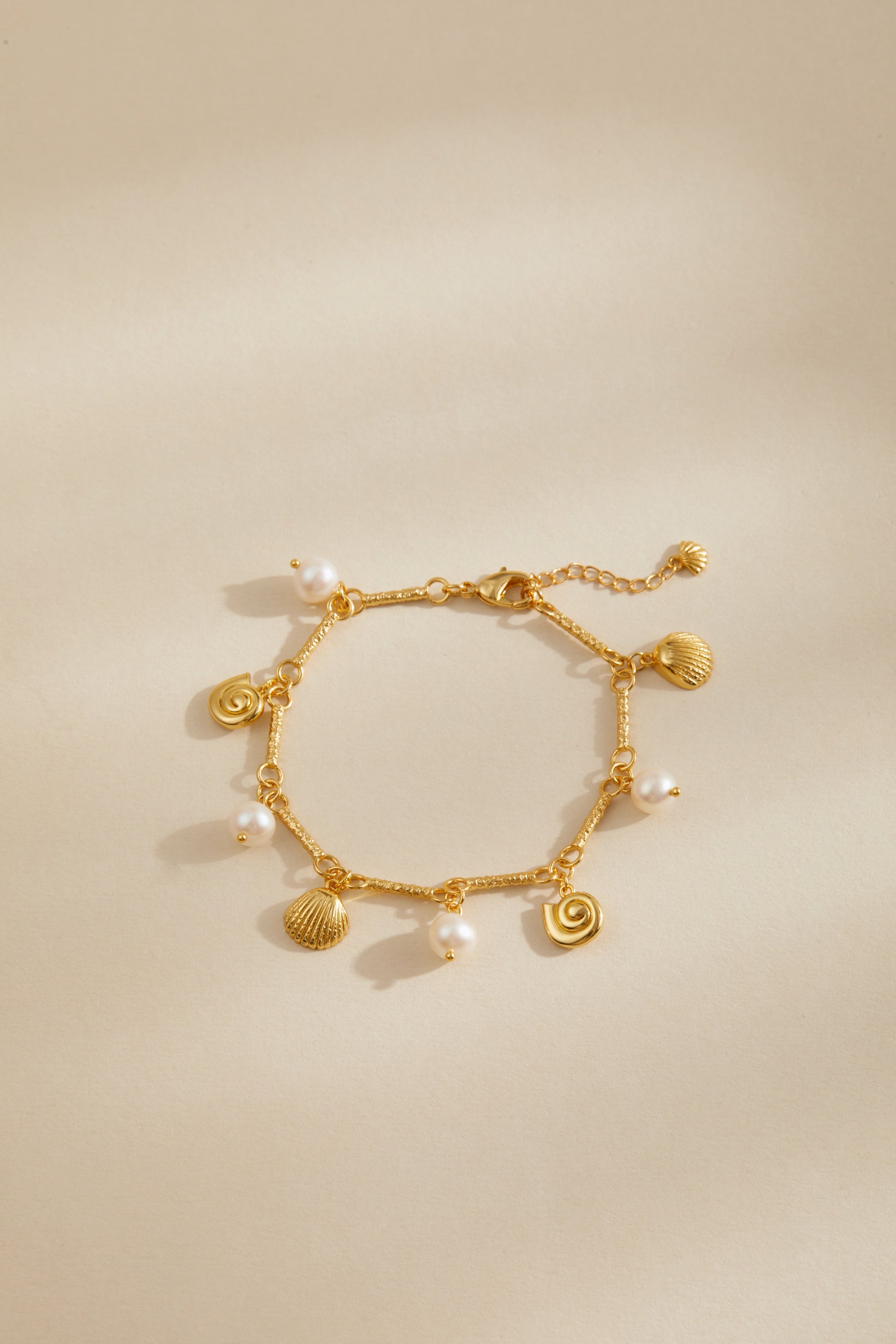 A dance of shells and pearls around your wrist — the Ocean Waltz Bracelet is an ode to seaside memories. With delicate freshwater pearls and whimsical charms shaped like golden conchs and scallop shells, this bracelet sways with every movement like waves meeting the shore.