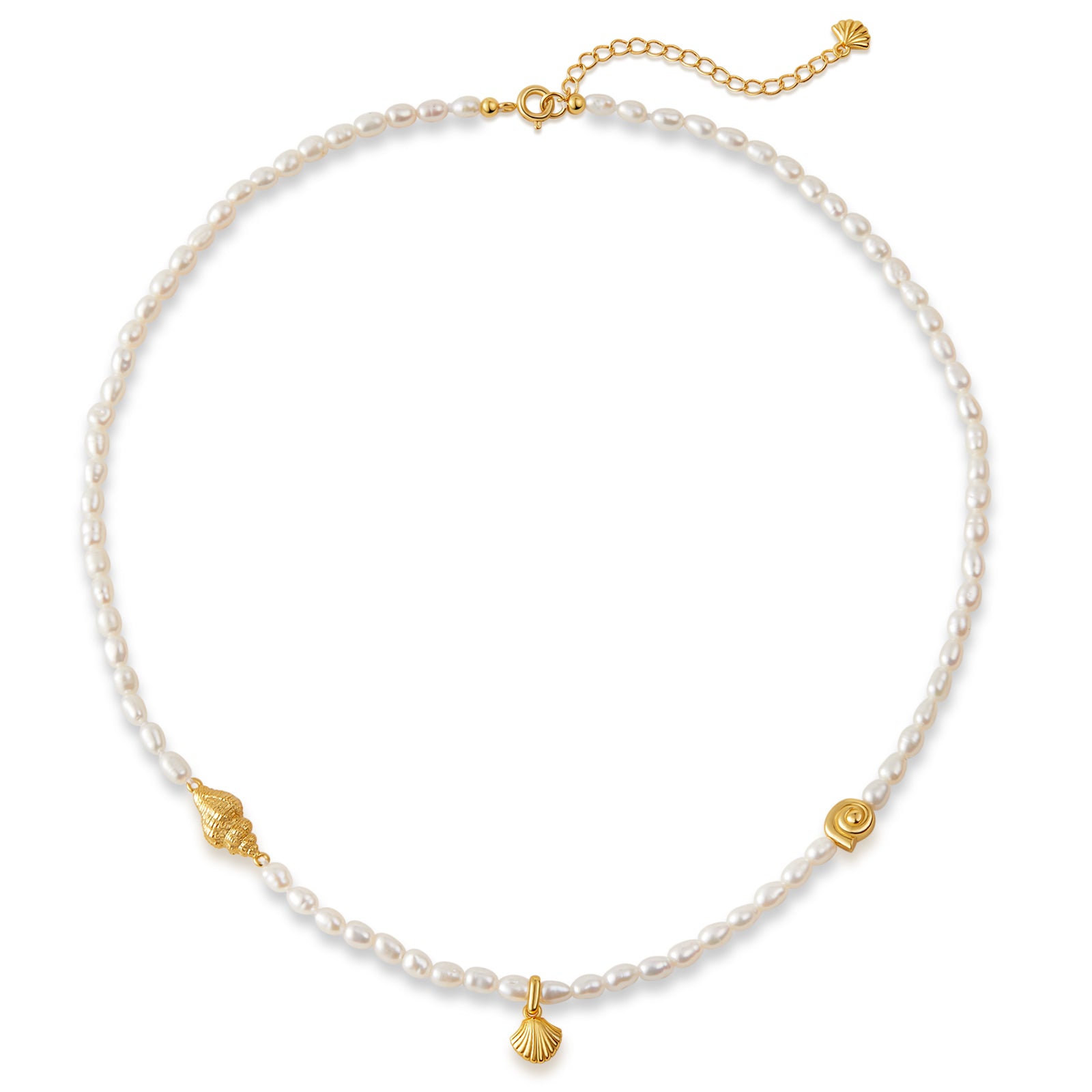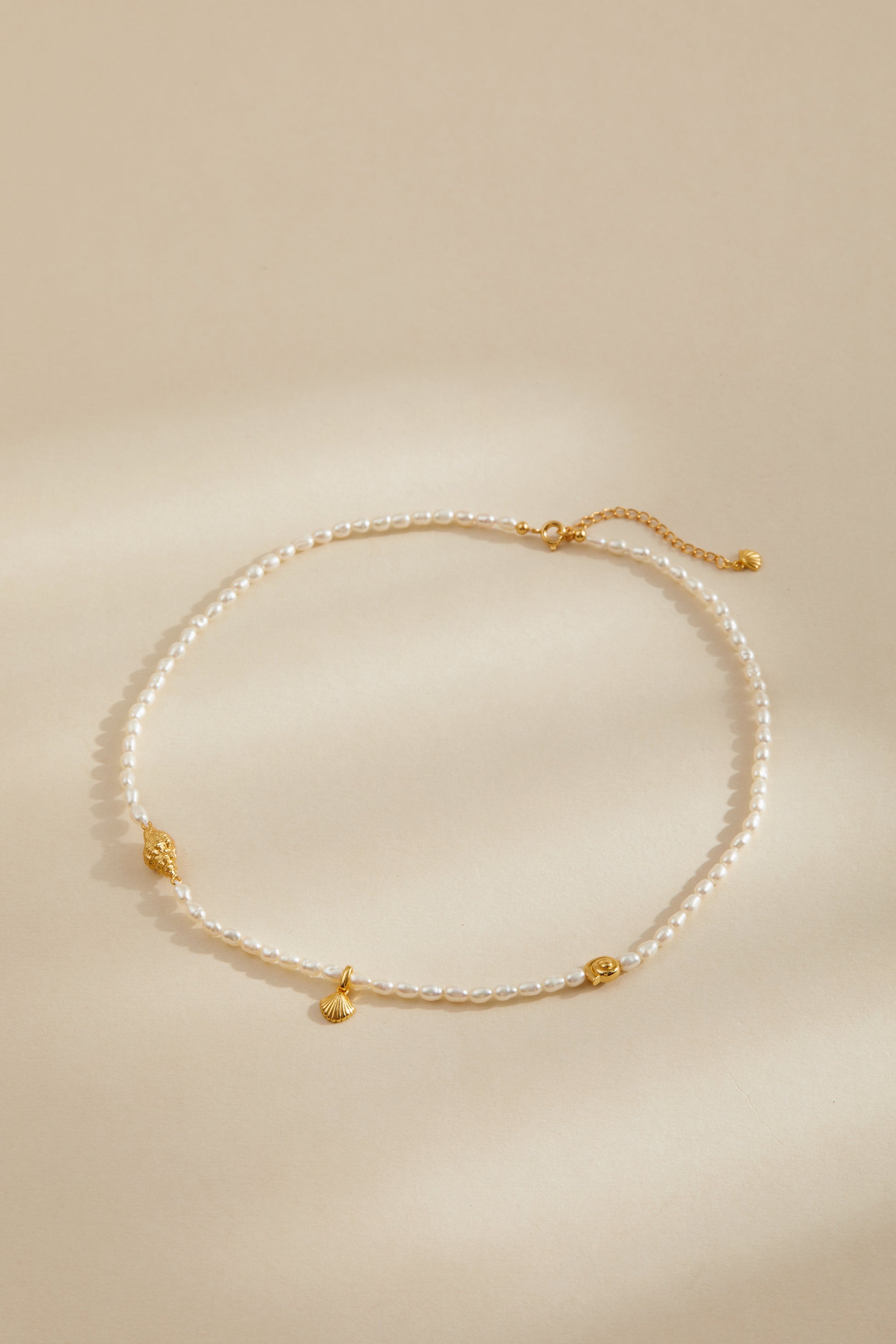 The Ocean Waltz necklace is a delicate ode to seaside romance — where moonlit waves sway in rhythm and every breeze carries a whisper of salt and sunlight. Hand-strung with natural freshwater pearls, this piece is adorned with three dainty 18K gold vermeil charms: a conch, a seashell, and a spiral shell — each one a symbol of ocean-born wonder.
